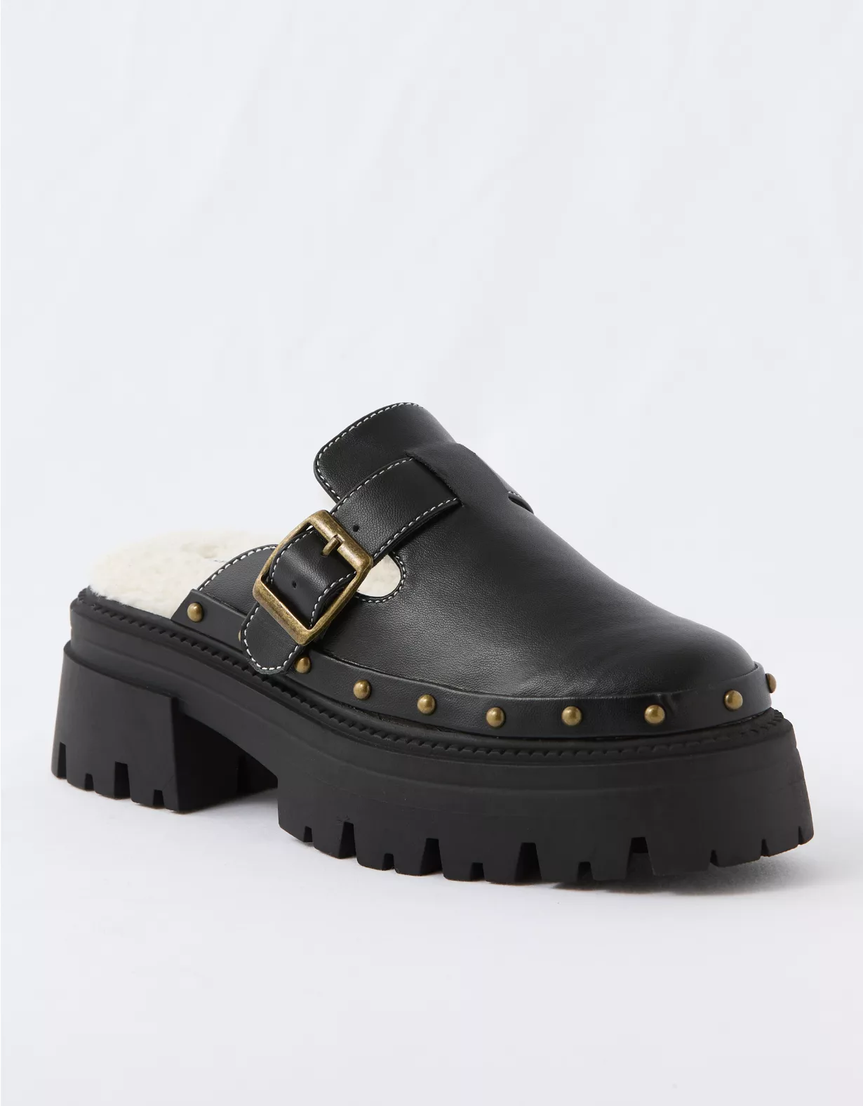 A sartorial clog in smooth vegan leather with cozy faux shearling & a chunky lug sole.